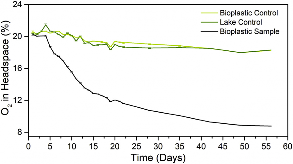 - The “Bioplastic Control” sample contained Teadomer in deionized water, allowing us to measure the bioplastic’s non-microbial depletion of oxygen.